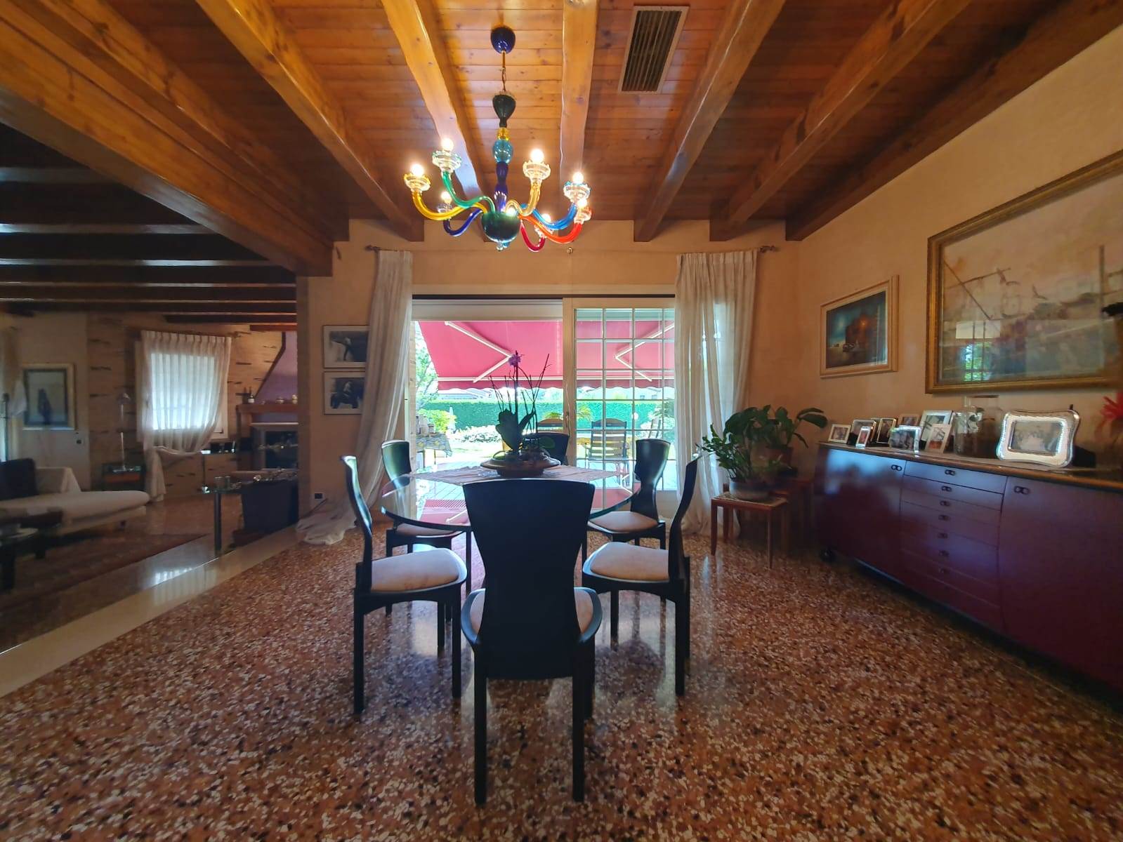 Dalla zona giorno è possibile accedere alle due zone porticate (40 mq e 34 mq) con una bellissima vista su giardino e piscina.