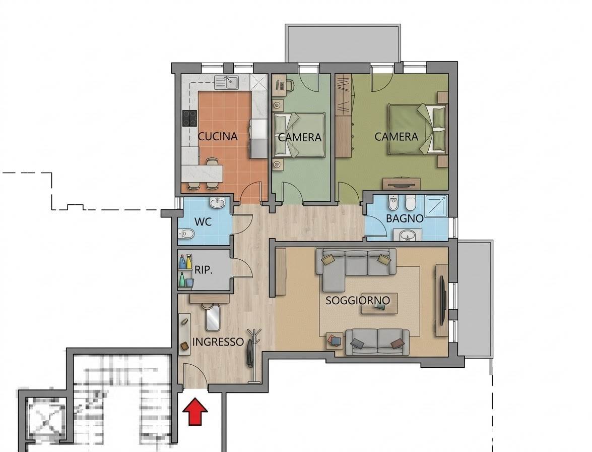Per chi necessita di una terza camera da letto, con qualche lavoro di ristrutturazione è possibile ricavare una camera da letto al posto dell'attuale cucina e creare una zona giorno con angolo cottura.