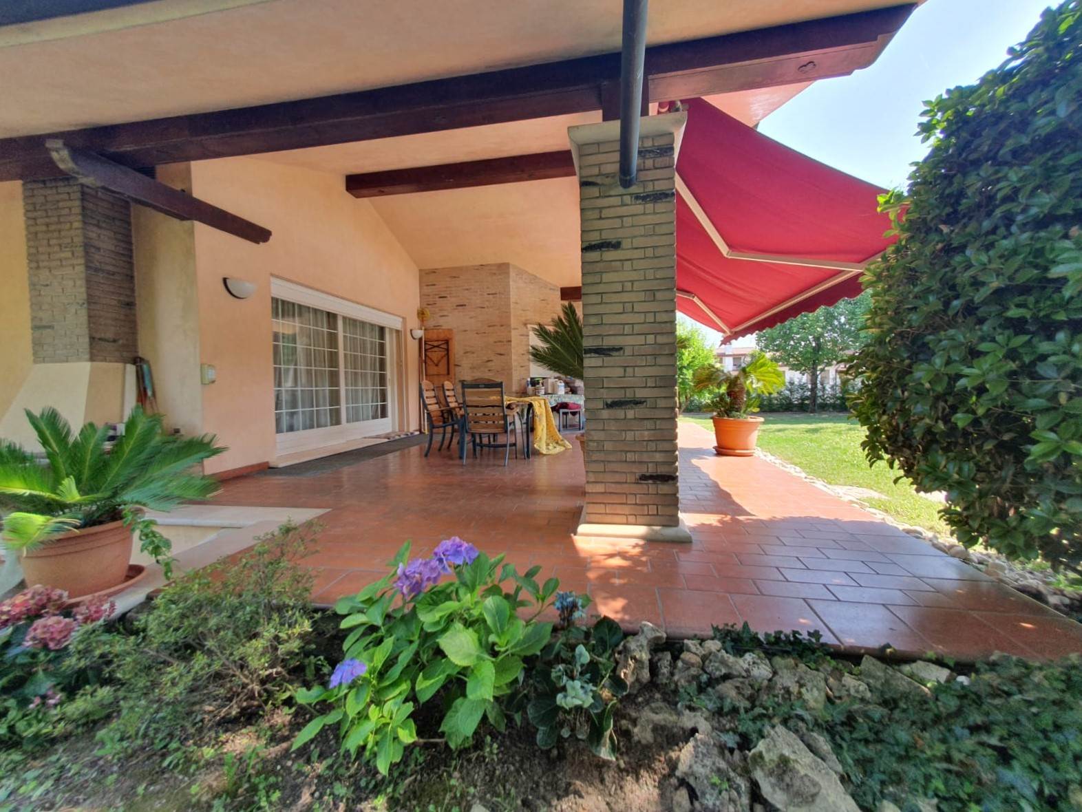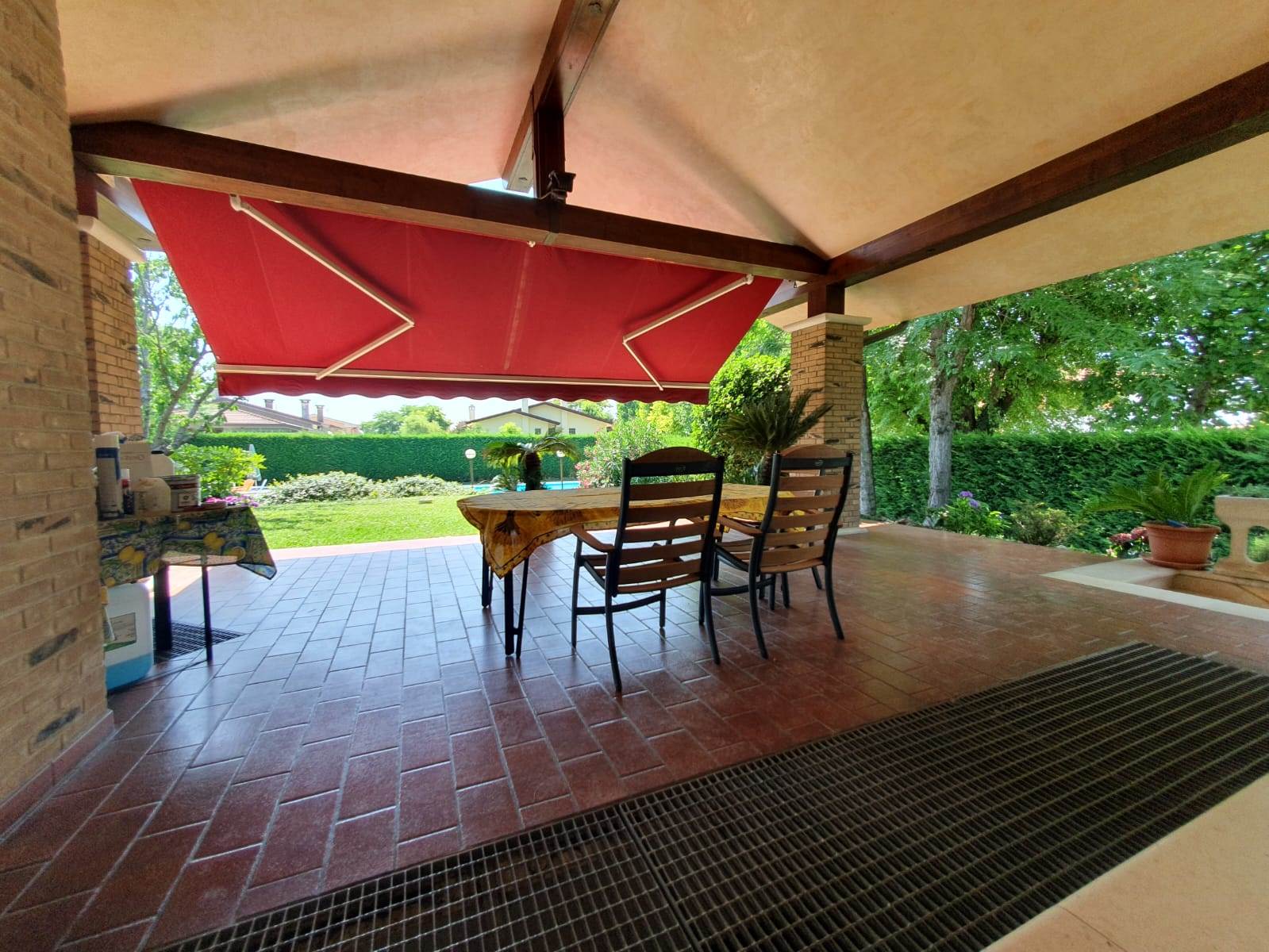 Dalla zona giorno è possibile accedere alle due zone porticate (40 mq e 34 mq) con una bellissima vista su giardino e piscina.