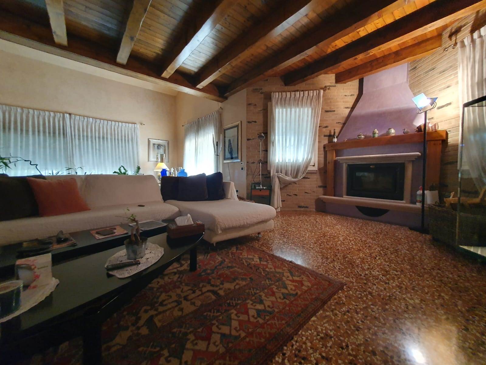 Pavimenti della zona giorno in terrazzo alla veneziana, zona notte in parquet, scala in marmo, serramenti in legno con vetrocamera antisfondamento, pareti intonacate con spatolato veneziano e con inserti di mattoni faccia a vista, soffitti finiti con spatolato veneziano e legno, pavimenti esterni in cotto e porfido.