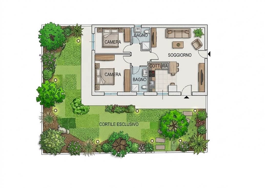 Il giardino circonda l'immobile ed è perfetto per godersi l'esterno nei periodi caldi, per famiglie con bambini o con animali domestici, dotato anche di ingresso indipendente.